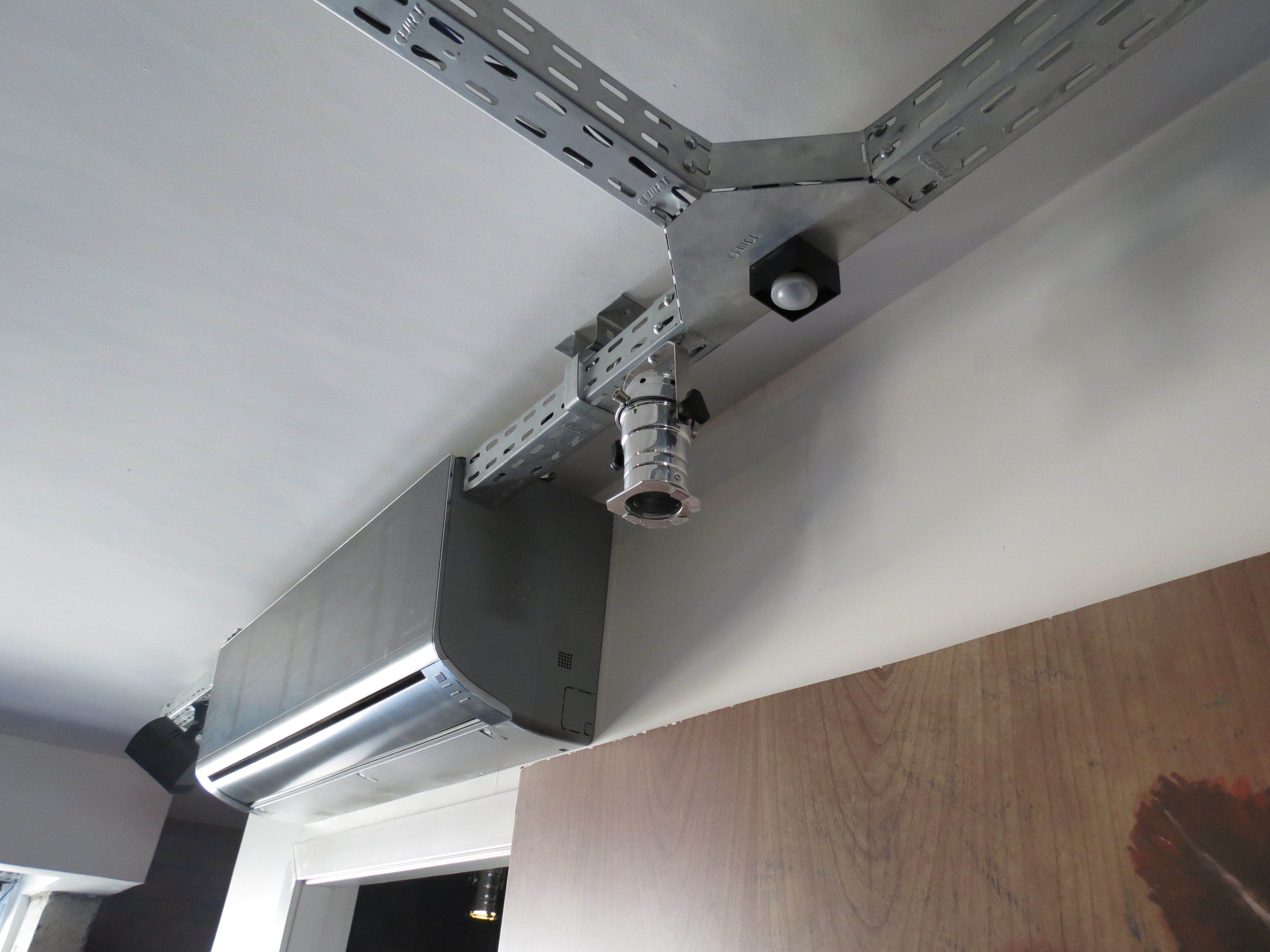 Os módulos da automação sem fio são muito pequenos, portanto podem ser facilmente colocados em qualquer lugar, neste exemplo, todo o apartamento foi projetado com a elétrica exposta em forma de calhas, sem forro de gesso. Se não fosse assim os módulos poderiam estar junto às luminárias também.